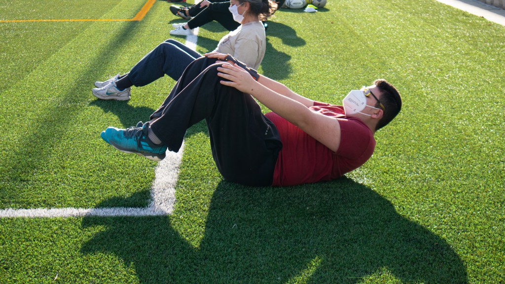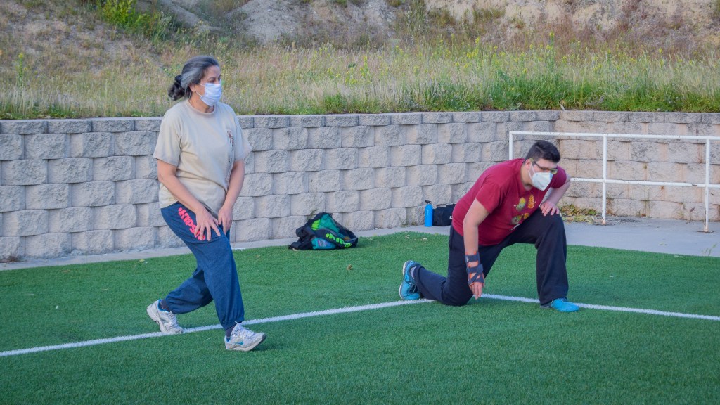Coaches help out, some carers join in and various brave parents try to follow their rhythm. A couple of giggles escape from their mouths as some stop to take a breath of “unfiltered air”; as long as they are 2-meters apart, they can momentarily lower their face masks to rest.