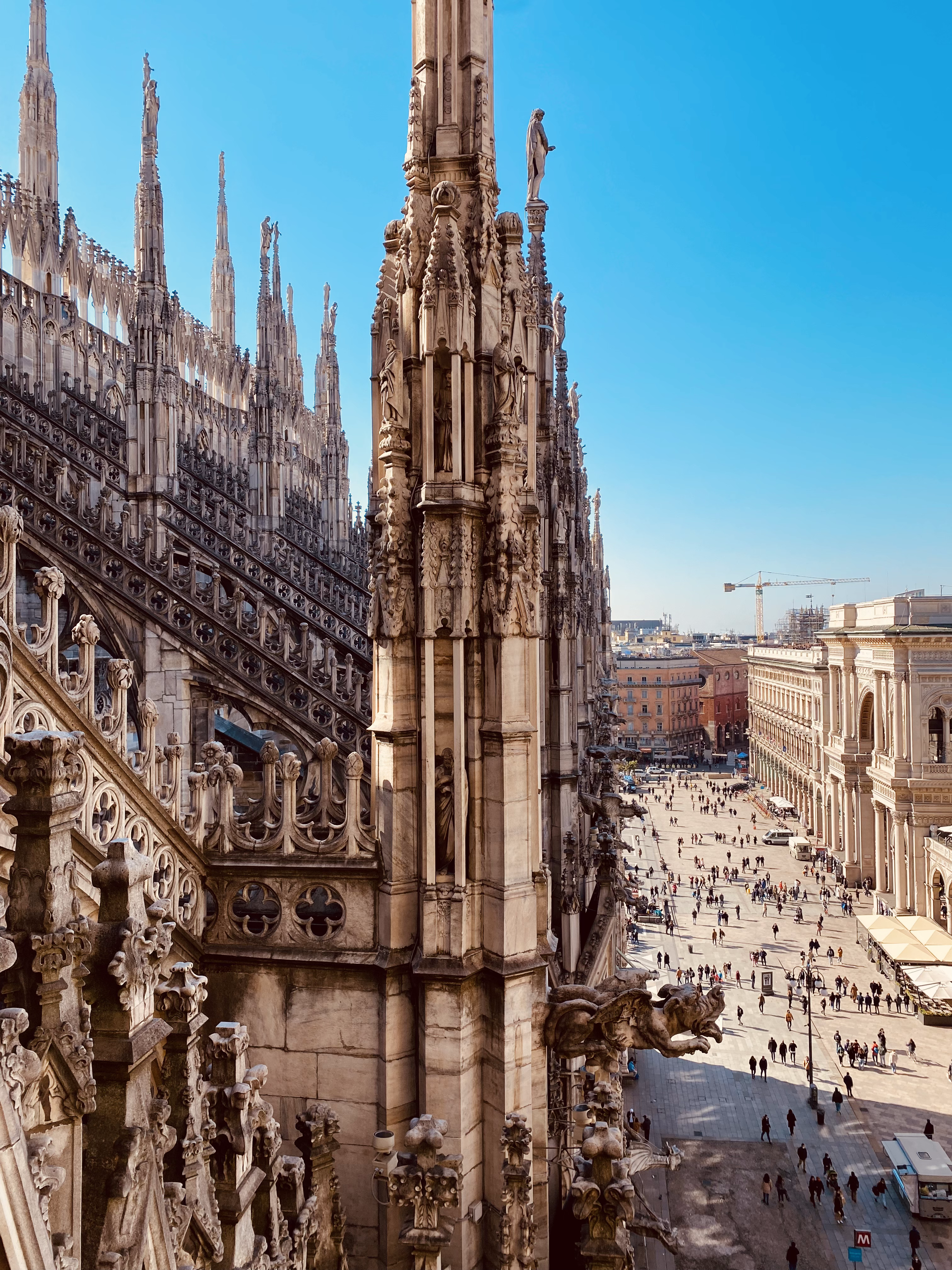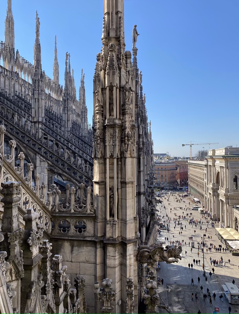 This is a photo I took of Milan Cathedral. I like this particular photo as I enjoy the contrast between the building and the people on the street below, I think it puts how large the cathedral is into perspective.