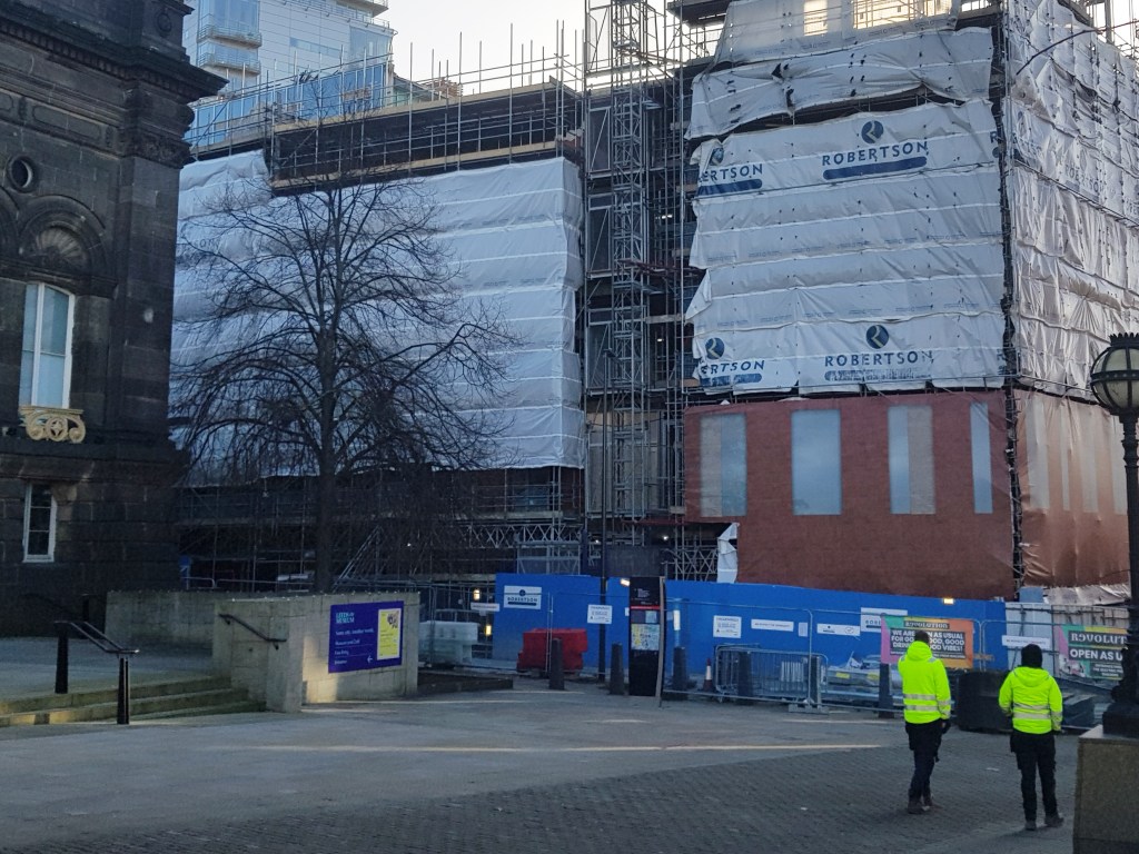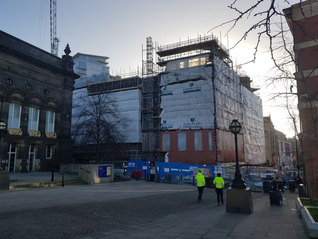 My second photo, taken as part of workshop task 1, needed a lot of work as it was not very well lit and was too large to be aesthetically pleasing. I first used the vibrance adjustment layer to edit the images colours. I moved the vibrance slider to -7 and the saturation slider to +4, a slight but noticeable improvement. I then created a brightness/contrast layer. I set the brightness to 49 and the contrast to -11. I then cropped the image using the golden spiral to draw more attention to the construction workers while simultaneously focussing the image onto the building more. In doing so, I believe the image worked better with the story it was linked to.