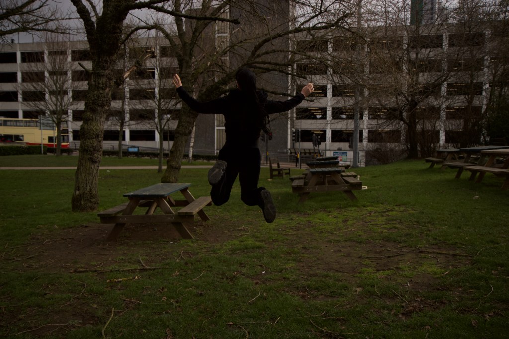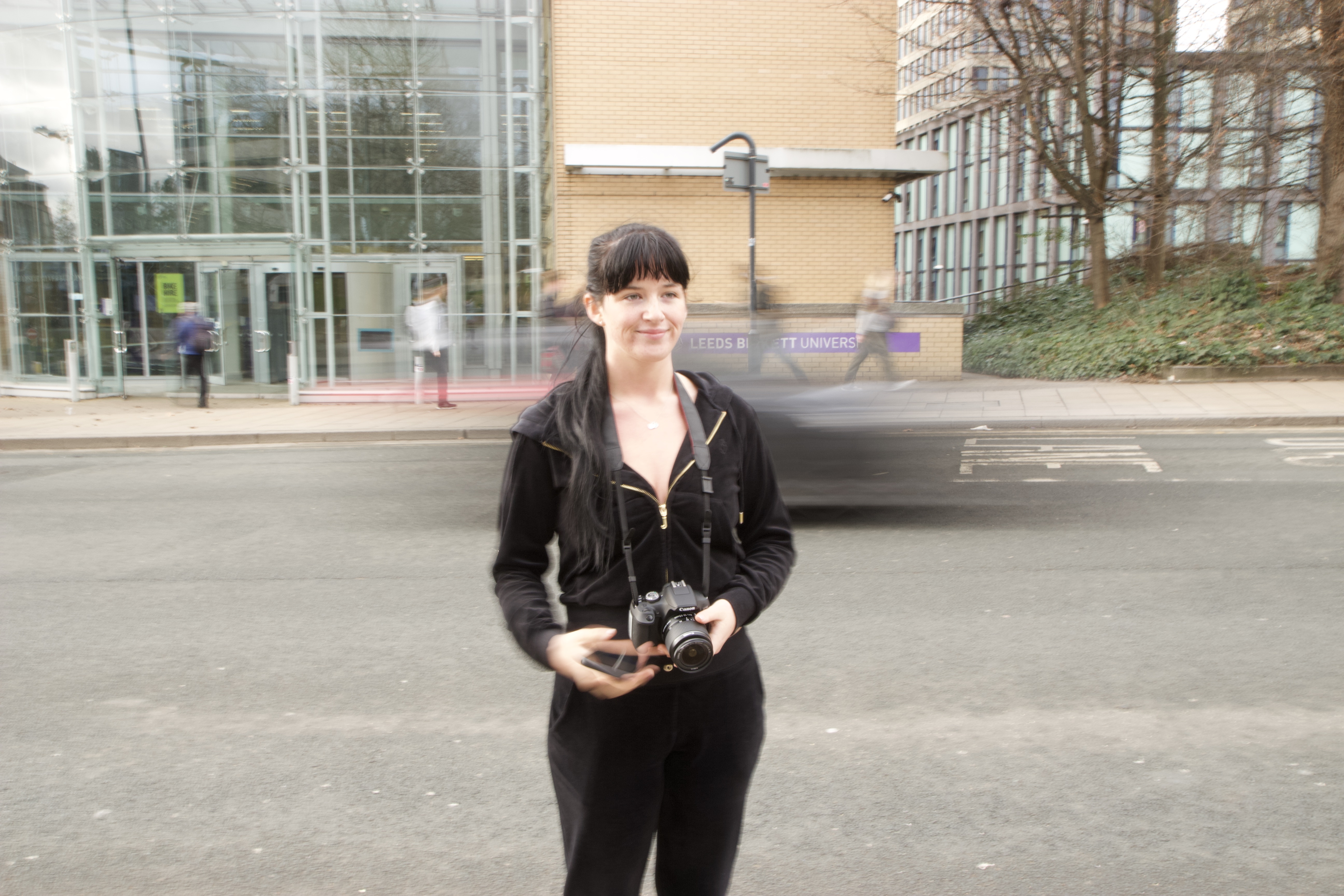 The second image is Rai standing in front of a busy road, as cars race by. The settings for this image were ISO 100, f20 and 1/4 s. Rai is the focal point of the image and in captured in photos while the car in the background is blurred.