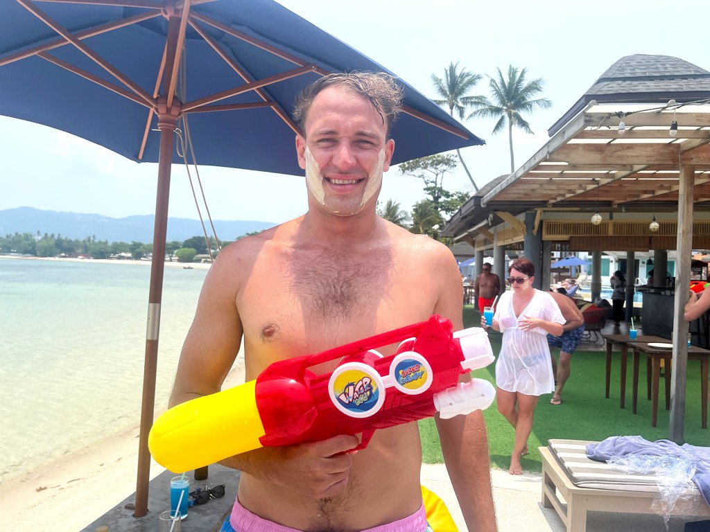 Robert Thomas with his water gun as he gets ready to head to Chaweng strip