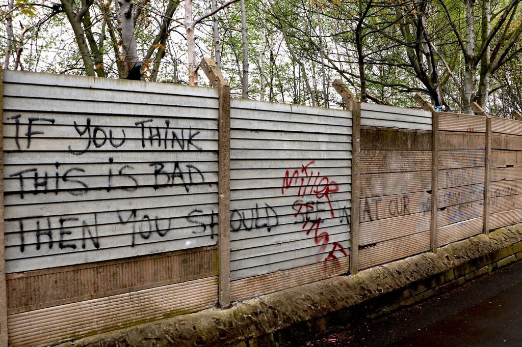 Taken near the ‘KEEP SMILING!’ fence in an alley filled with needles, baggies and junk food packets, this graffiti states ‘IF YOU THINK THIS IS BAD THEN YOU SHOULD SEE WHAT OUR GOVERNMENT IS UP TOO!’ Symbolising the failure of educational institutions in deprived areas of the UK, the grammar for this sentence is incorrect in numerous places; uncapitalised ‘i’s, too is spelt incorrectly and the tag itself isn’t equally split across panels but is instead listed on one and trailed across 4 more. Conversely, the idea that the government is doing something worse than a community with a high crime rate displays a deeper level of knowledge on national politics as well as a sense of awareness of the area you live in and the reasons for it.