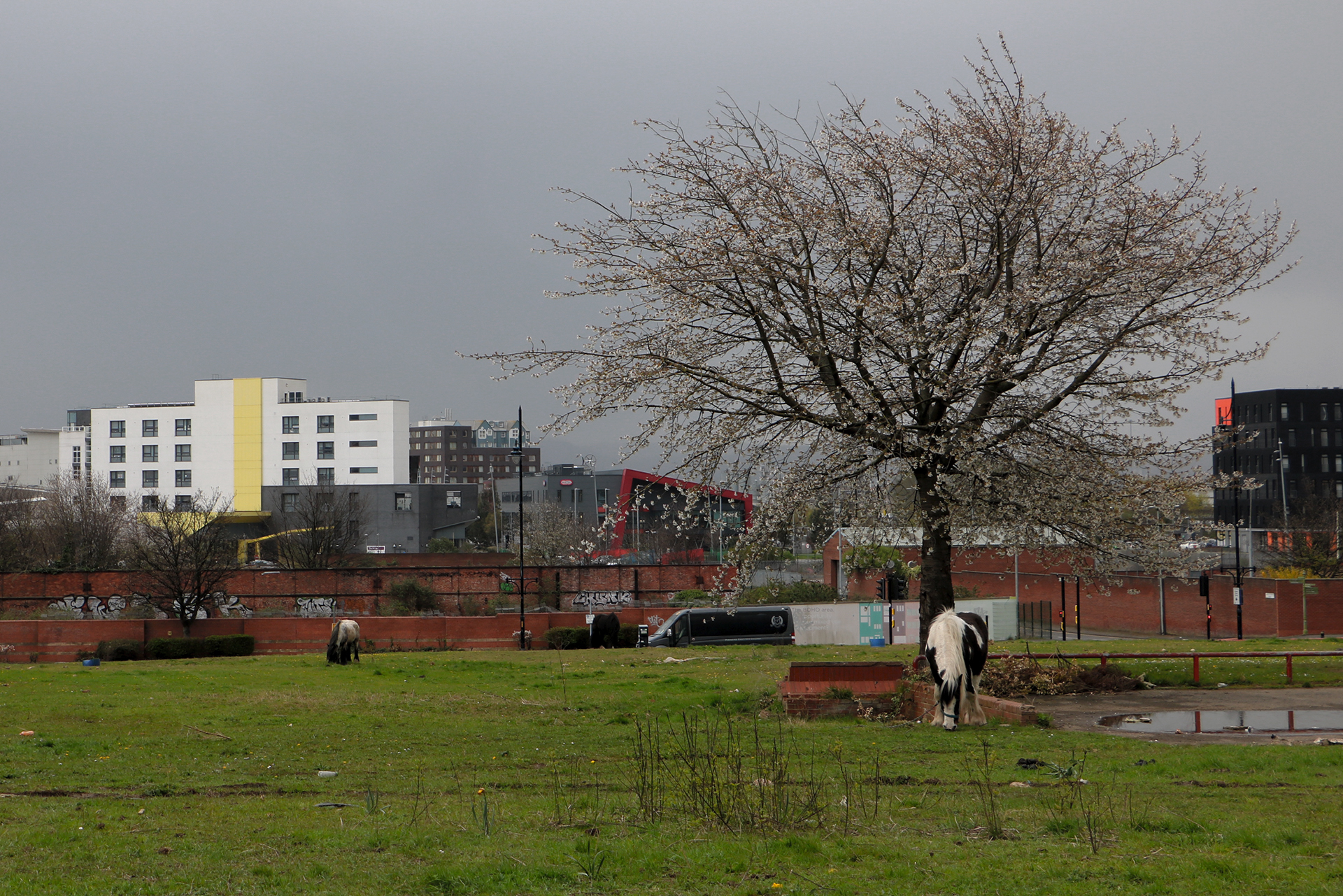 Middlehaven, the original town center of Middlesbrough, now sits along the former dockyards as an industrial estate filled with disused land and failed regeneration attempts. Not pictured in the image but at the center of the grass square is the old Middlesbrough Town Hall, now a rundown shell of what it used to be. Travelers who come and go from the estate and the greater Teesside area often leave their horses and ponies in less populated areas and return for them during the summer months. The area is representative of the true heart of Middlesbrough, both figuratively and literally. The new builds in the background of the photo juxtaposed with the abandoned ponies/horses and decrepit town hall is indicative of false regeneration; not improving areas that need economic investment, but building new high-rises away from the deprived former residential areas as a distraction from the real issues facing the town and the greater region.