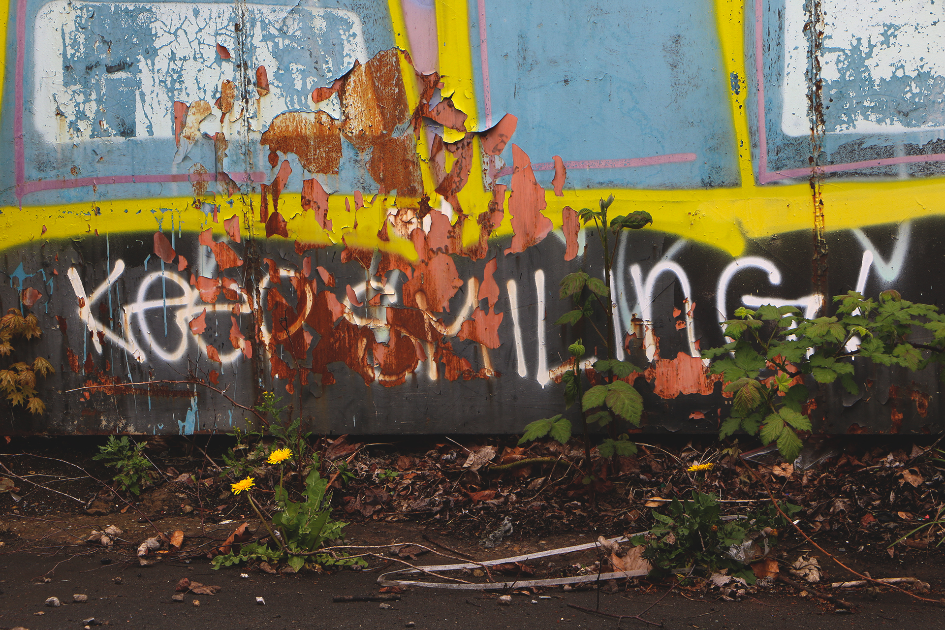 Photographed in Oxbridge in Stockton-on-Tees near a metals shop, this metal fence was adorned with graffiti and faded paint, the highlight being the somewhat ironic ‘KEEP SMILING!’ sentiment. The neighborhood surrounding this fence is renowned for its high crime rate and high deprivation so the reminder to ‘KEEP SMILING!’ acts as both a brutal reminder of the area you find yourself in, and hopeful encouragement to push through adversity. The decaying paint lends to the former whereas the flowering weeds, regardless of whether they are weeds or not, reinforces the latter.