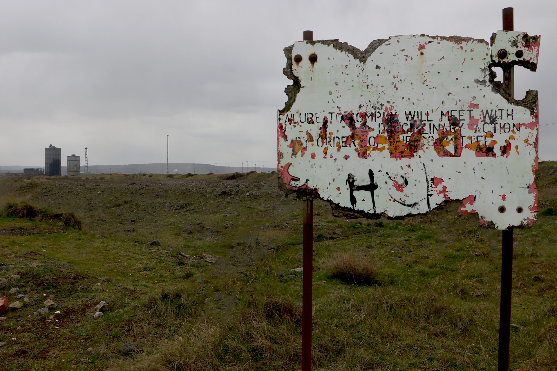 Pictured above is the South Gare, an area of reclaimed marshland which once housed the vast Redcar Steelworks and accompanying manufacturing plants. With a radius of around 10 miles, the former works once dominated the landscape of the Tees coast, a fitting image for a region whose growth and eventual decline was enacted by heavy industry. Towers visible in the background are all that remain of Dorman Long’s heritage as a steel powerhouse, however, even these solitary monuments to a distant time face demolition in coming days. The sign, now no more than a bitter reminder of the once intimidating nature of heavy industry, sits alone surrounded by former blast furnaces and coal storage land as evidenced by slag and coal rubble littering the land.