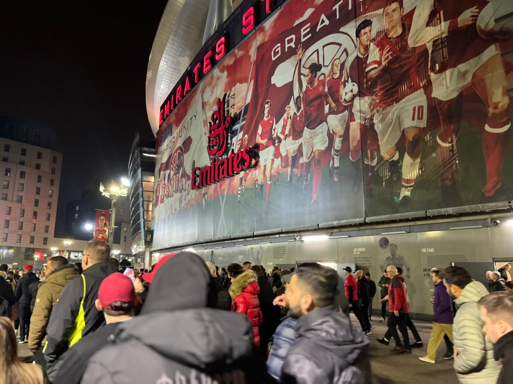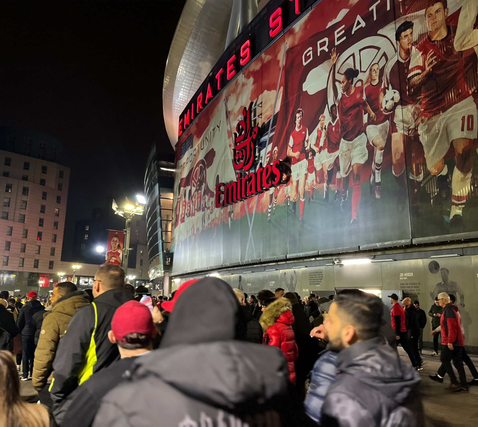 This image was taken in the aftermath of the Arsenal V Brentford game as fans made their way home and out of the stadium. Again, using the perspective crop tool, I used the image on the side of the stadium as a guide, specifically the shorts with the number 10 on (the player is Jack Wilshere) as the the individuals cropped out were too blurry. For brightness, the ‘After’ image is -20, with the contrast being 30. Due to the mass amount of lights around the stadium, these settings toned this down and made the image slightly diluted, which I see as positive.