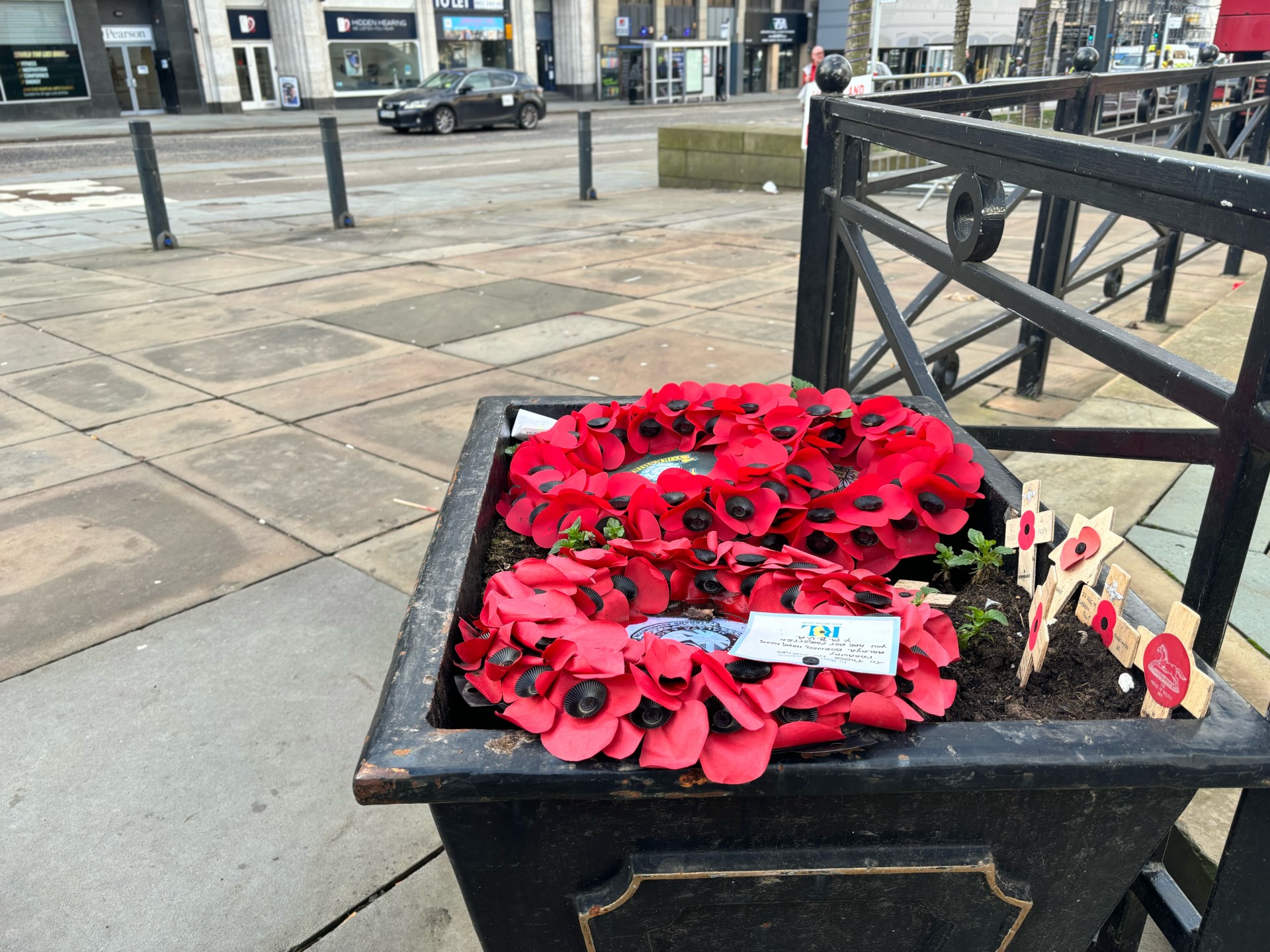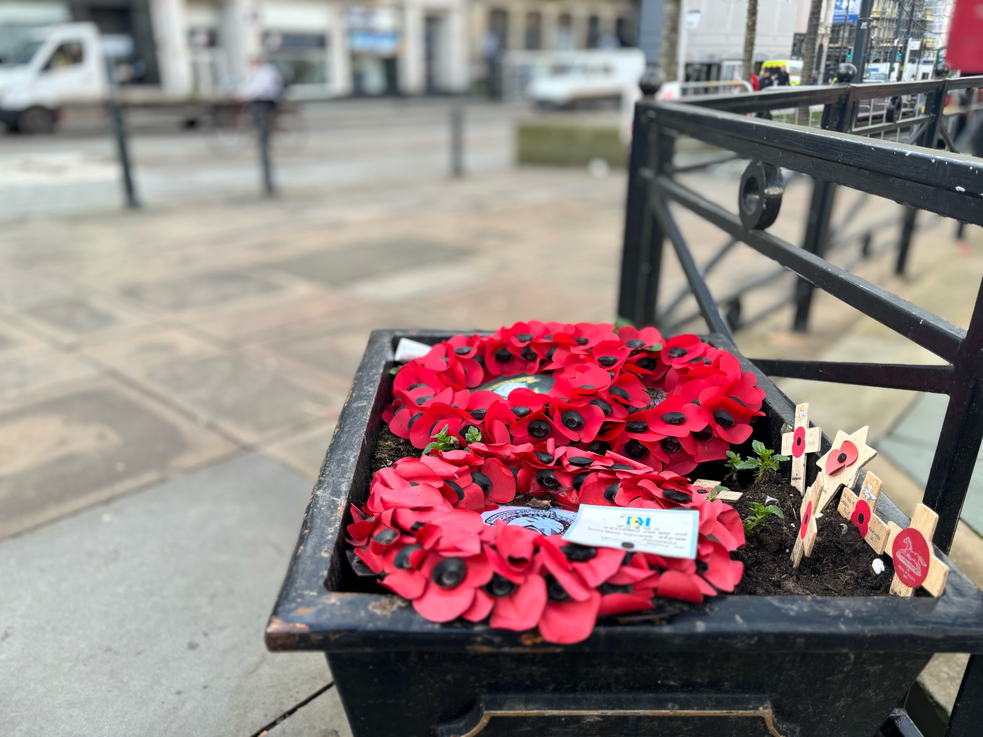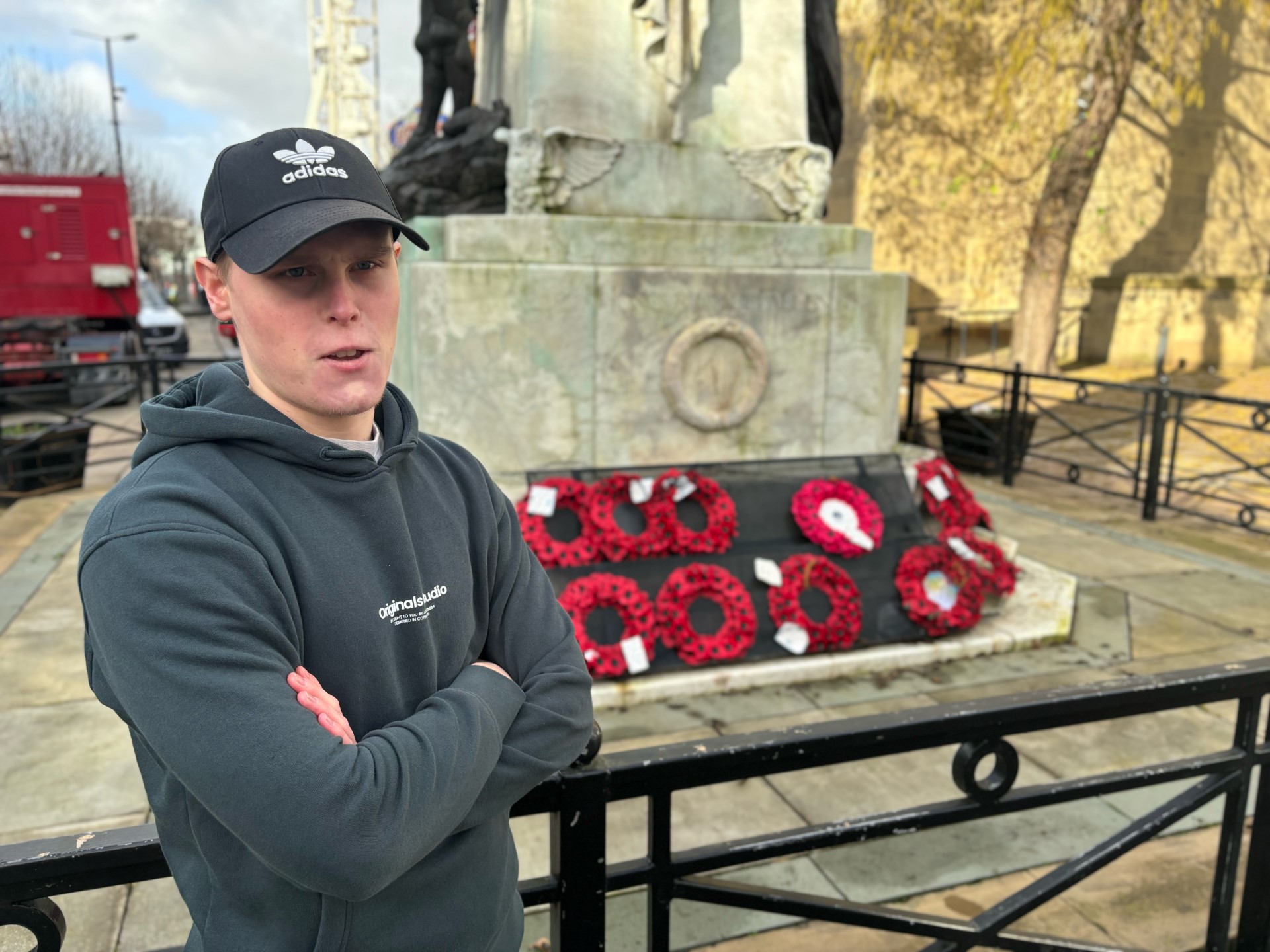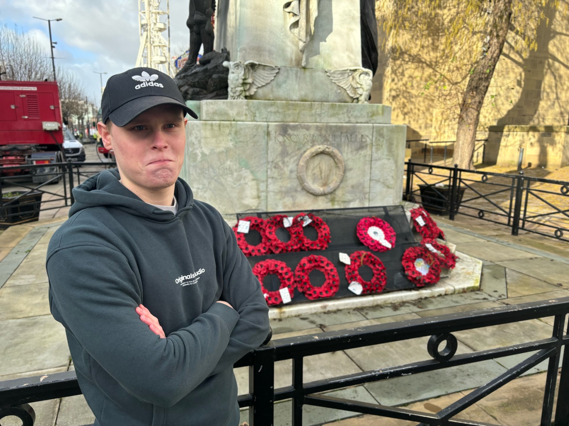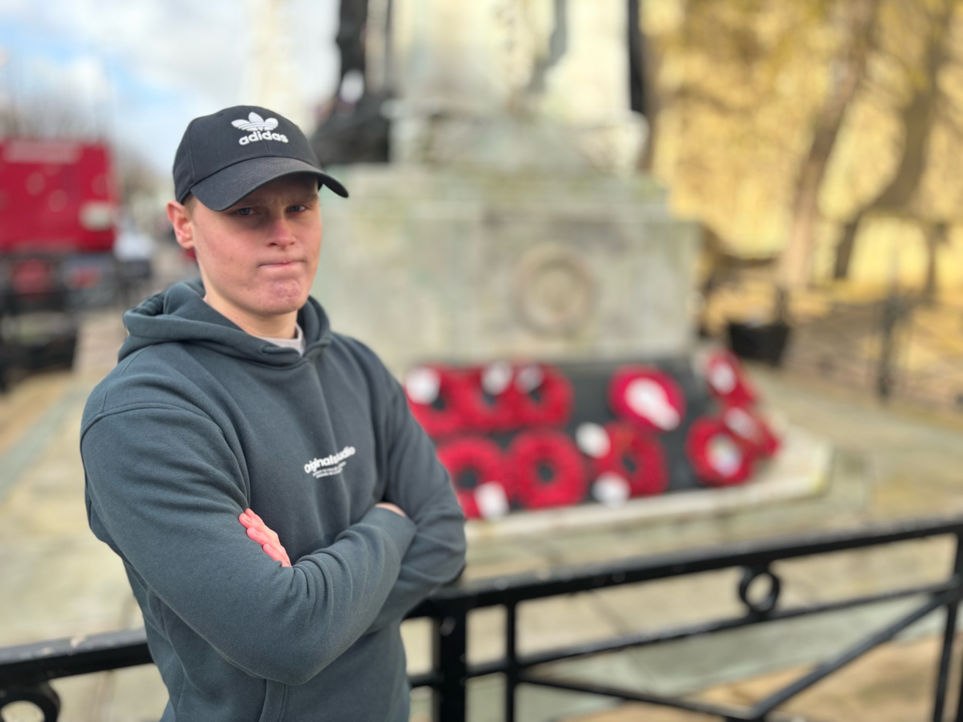For this image I had the model stand infront of a war memorial stand with poppy wreaths laid out. I used a low F stop in order to focus on the model and his expression whilst the memorial was blurred but you can still make out what is in the background.