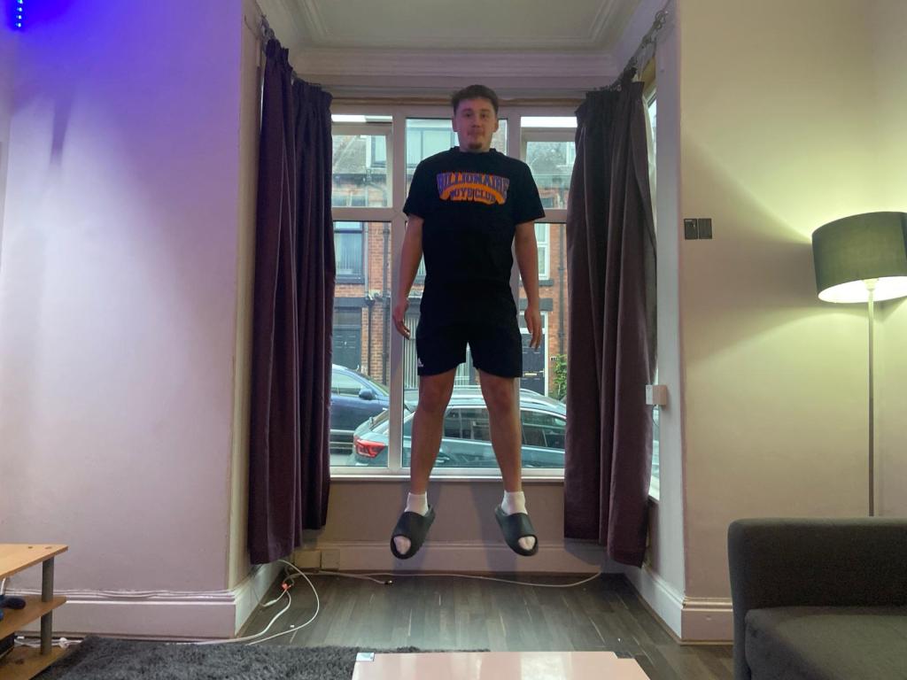 I took this photo of my friend using the burst mode on my camera. This image came out well, as he is not blurry, and at the peak of his jump it gives a levitating effect. I had to focus on getting the framing of this shot right, by giving him enough head space to jump into, whilst keeping the subject central in the photo and the room.