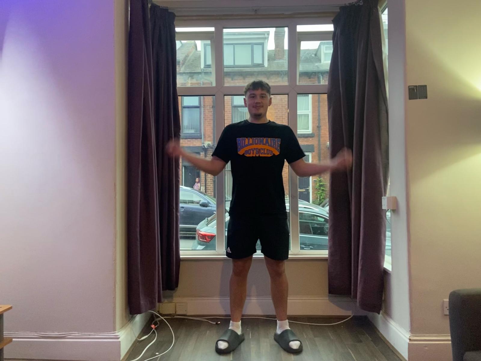 I took this photo of my friend using the burst mode on my camera. This image came out well, as he is not blurry, and at the peak of his jump it gives a levitating effect. I had to focus on getting the framing of this shot right, by giving him enough head space to jump into, whilst keeping the subject central in the photo and the room.