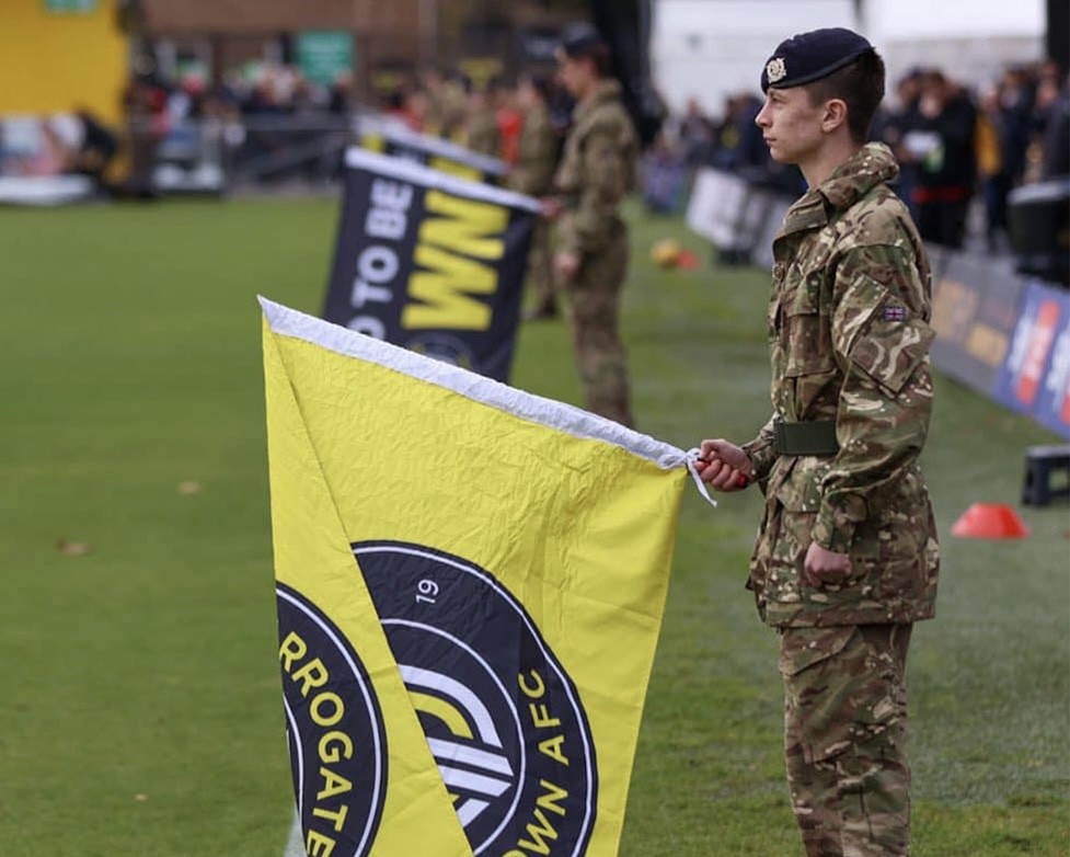 In the build up to kick-off a group of the soldiers from the College had the role of being flag bearers, holding the flags and leading the teams onto the field. Being a flag bearer is historically seen as a gesture of pride and honour, so by Harrogate Town giving them the responsibility was a significant moment which allowed them to represent the College whilst also contributing to the atmosphere on the day. Speaking to the young soldier in the image above, he said, “It’s a really special day for the College… having the opportunity to be a part of the matchday by being a flag bearer today was a real privilege. It was my first time watching Harrogate Town, so it’s been a fun experience while remembering those who sacrificed before us at the same time.”