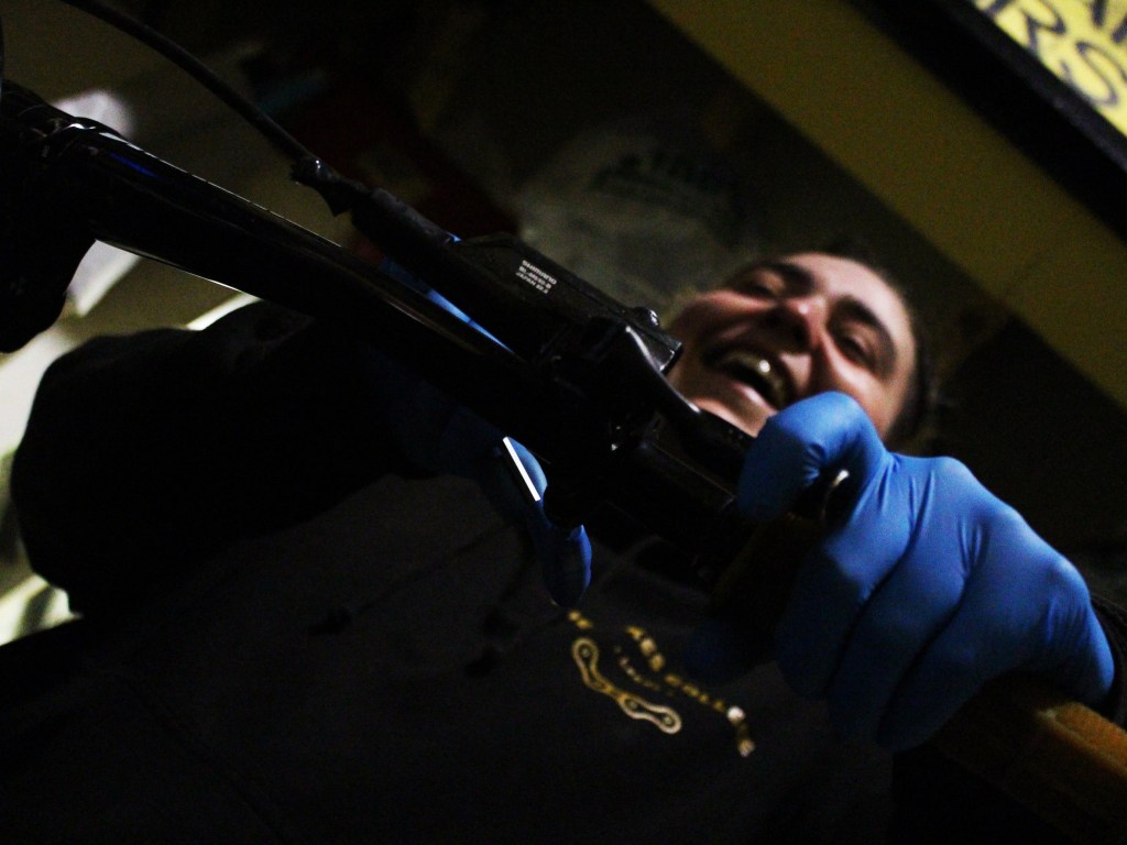 I wanted to take a shot of Di-Clemente’s hands as she was fixing a customer’s bike. However, I wanted to keep her face, the shop logo, and the bars in the picture.