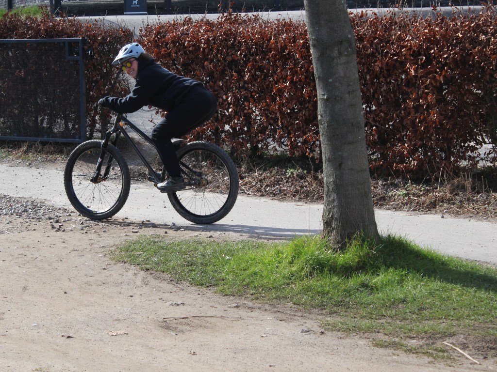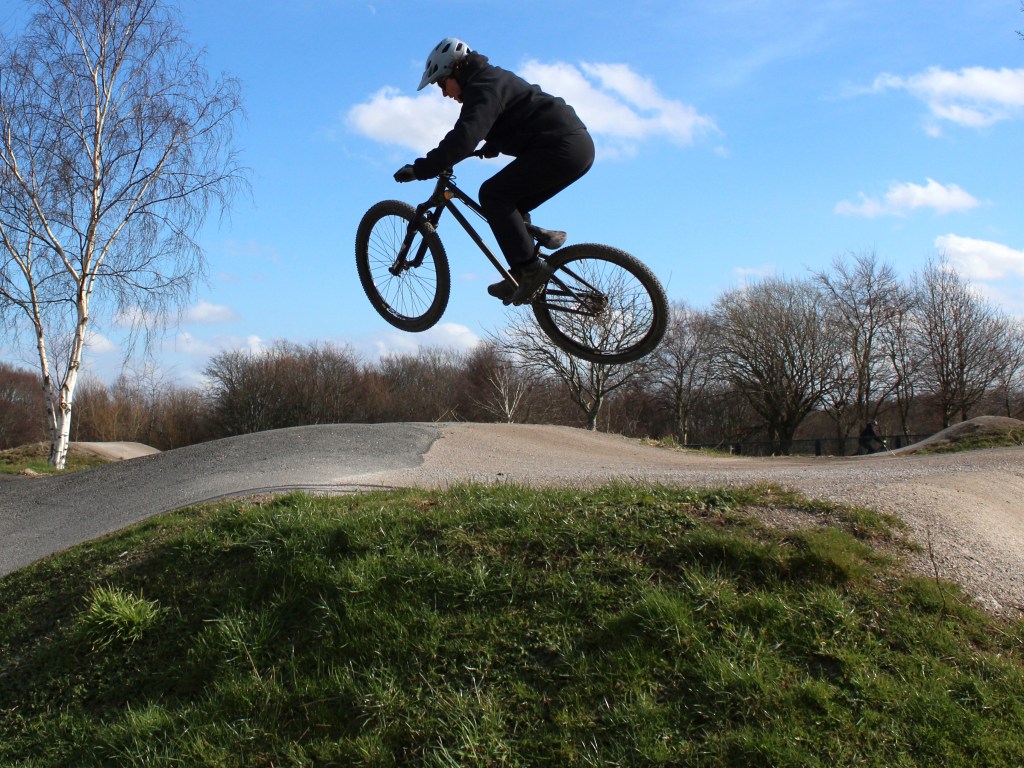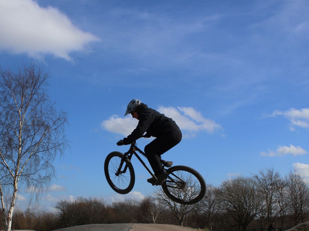 Here, less of the sky and more of the ground can be seen. This gives an idea to the viewer how high up in the air the jump is, and provides some more context and understanding to the picture.