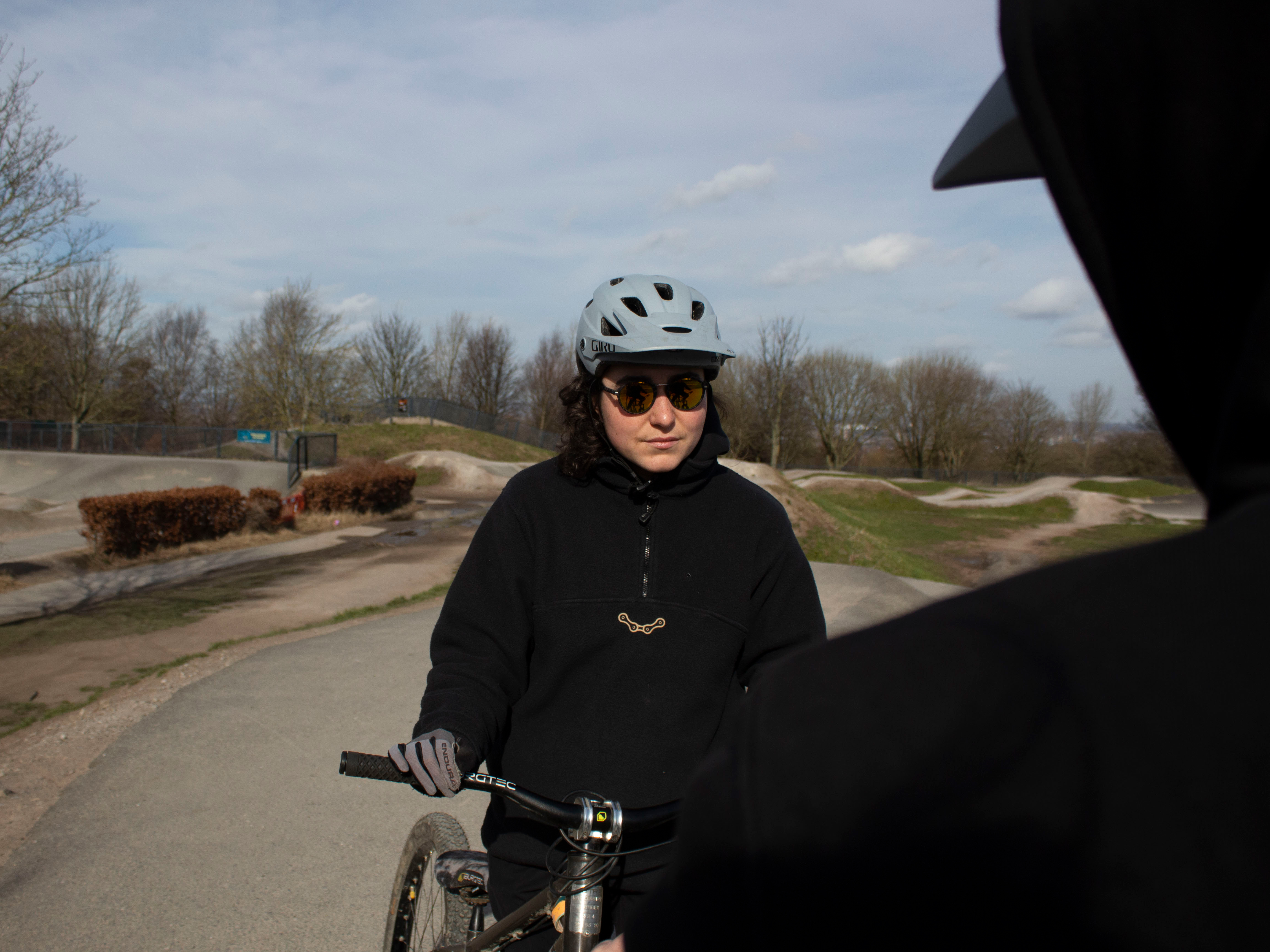 In this picture, the sunglasses add story to the image. You can see David in the reflection on his bike, leaning in to Amelia and listening intently to what she had to say about women in cycling. This is a subtle detail but works brilliantly.