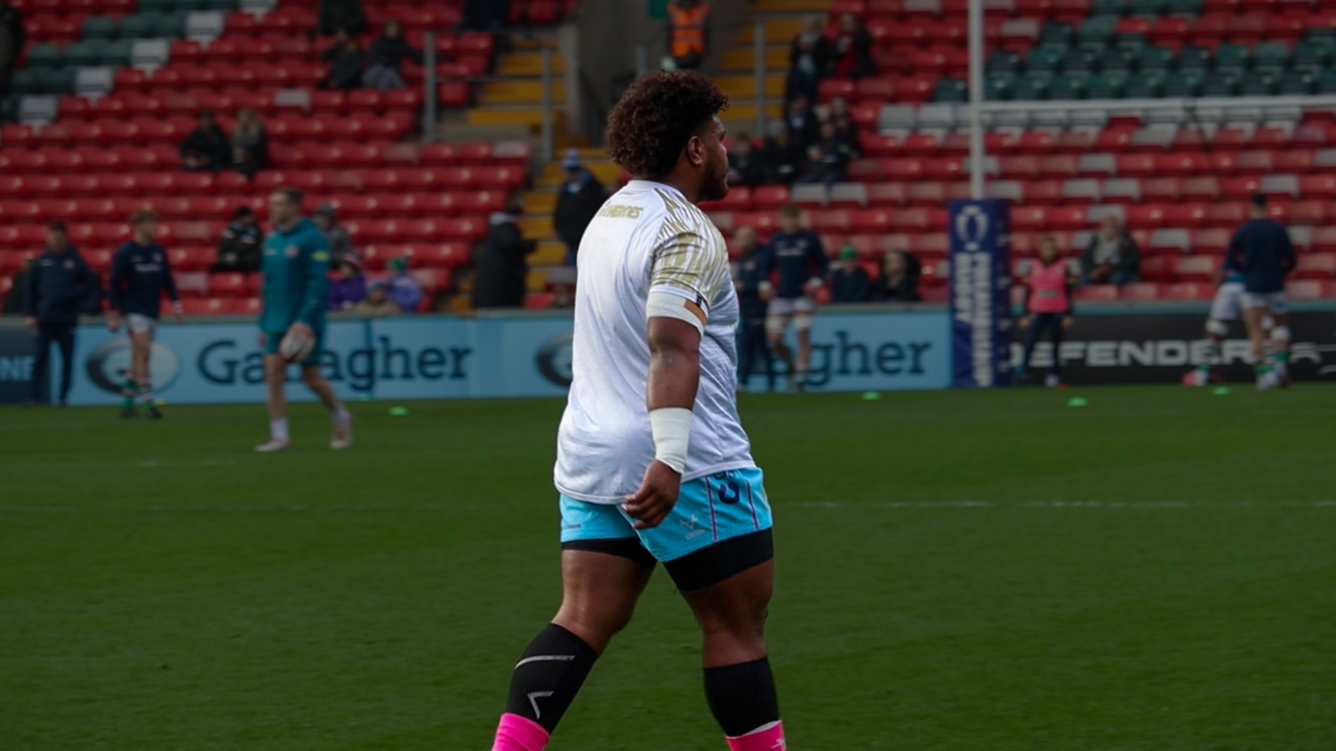 Prop, Vilikesa Nairau, warming up at Welford Road