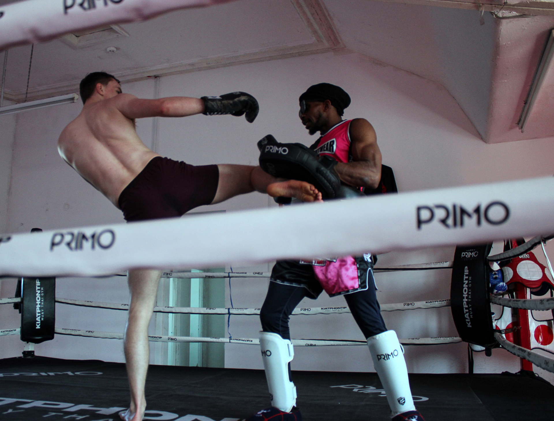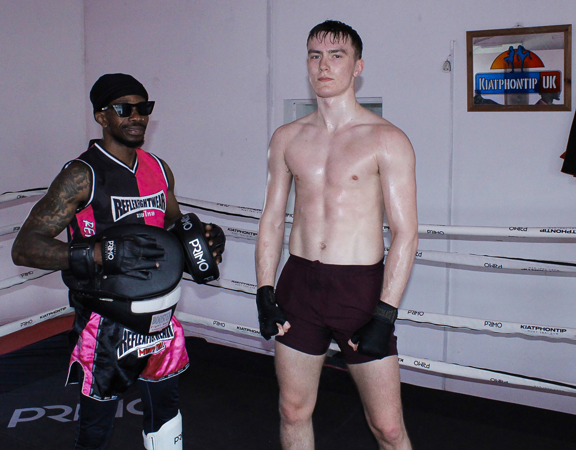 Wilson Pips (left) after a pad session with Walters. Pips is one of the main coaches at Kiatphontip Gym